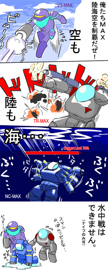 MAXは簡単に言うとパワードスーツで、攻撃力も耐久力もありますが応用が利かないぶきっちょさんです。 MAXには対物、対空、対人の3種類あるので戦況に応じて使い分けましょう。