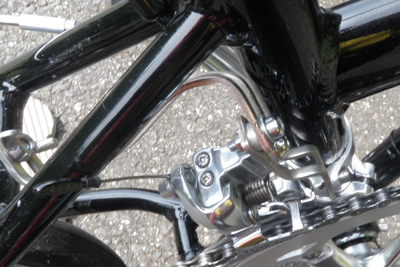 ホイール、スプロケはもちろんフロントダブル化も独特の方法で実現している。
