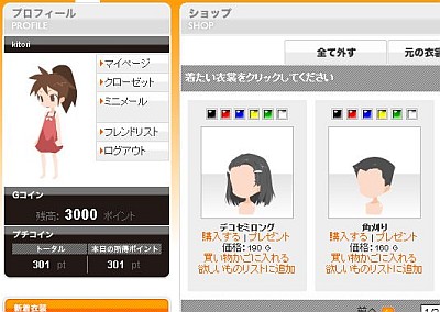 オープンβでは最初から3000ポイント分持っているのでいろいろお買い物ができる。髪型、顔、トップ、ボトム、アクセサリー、さらには自分の部屋の内装アイテムとかも売っている。