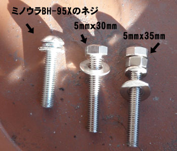 左から、BH-95Xについてるボルト、ちょうど合う30mmのボルト、長すぎた35mmのボルト。