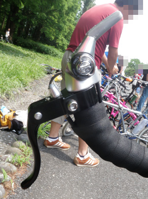 ただこれはロード用のブレーキレバーでVブレーキを引いているので、かなり深く引かないと効きが微妙。