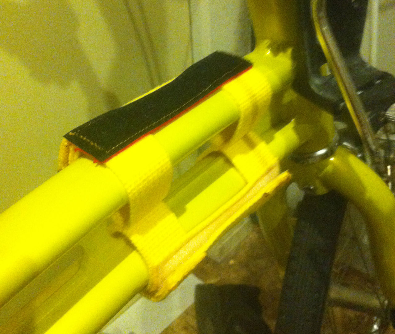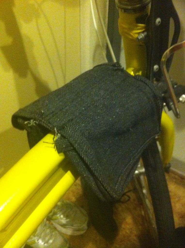 普通のフレームバッグだとフレームにベルトまわさなきゃならないので付け外しがめんどくせぇなあと思っていたので作った。